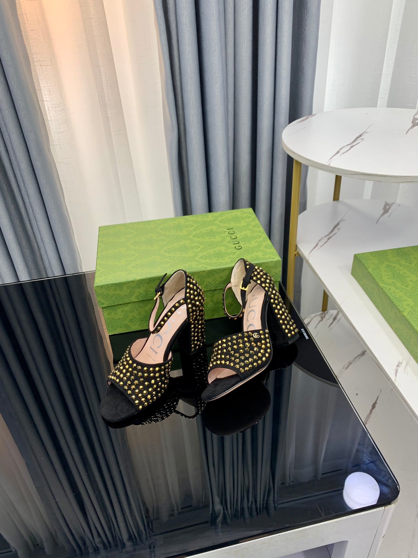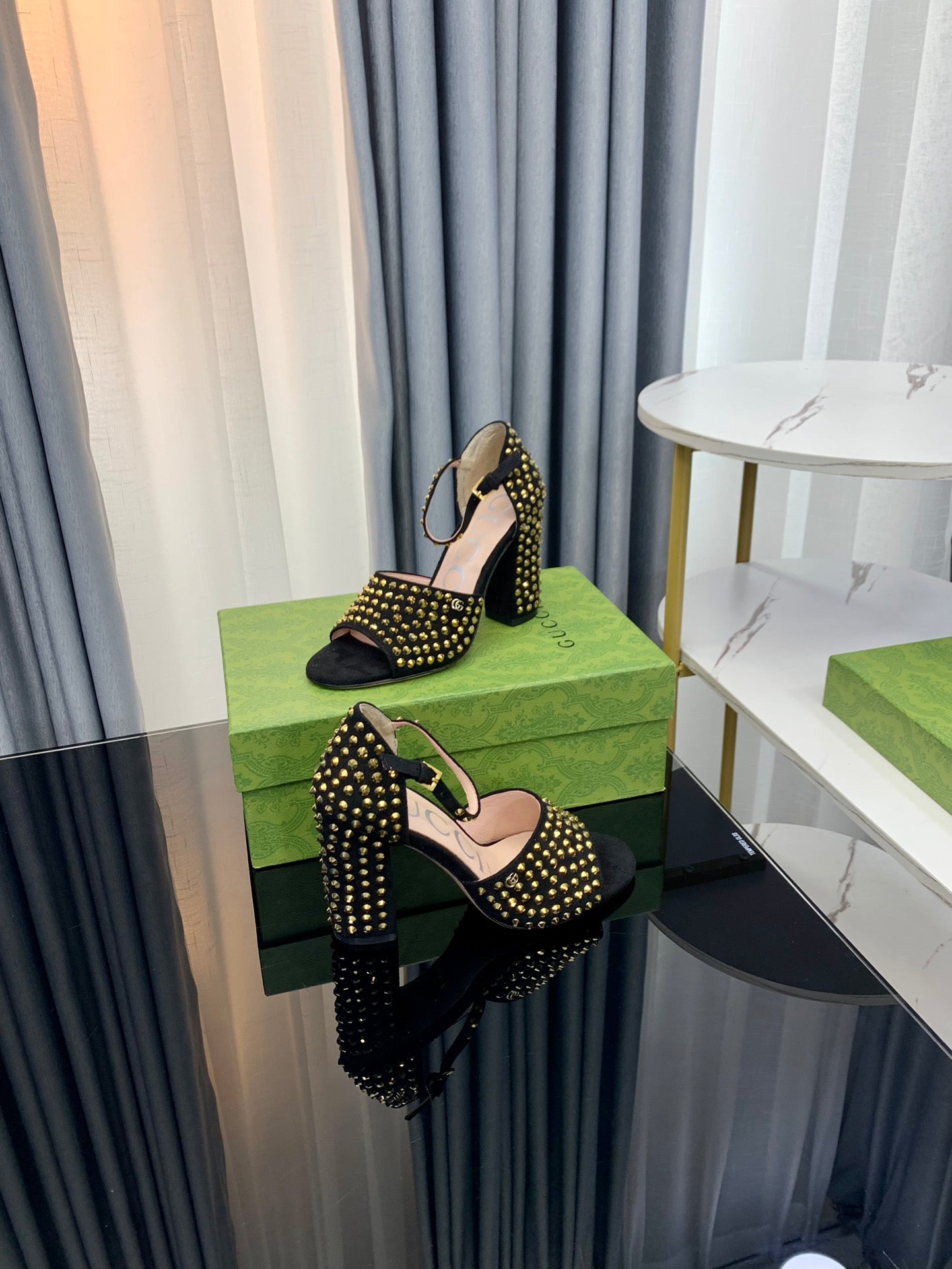 Step into summer with these GUCCI-inspired open-toe slides featuring gold stars and sparkling rhinestones. Made with imported materials, genuine leather insoles, and a 10.5cm heel, they offer high-end style and comfort in a true 1:1 original-grade design.