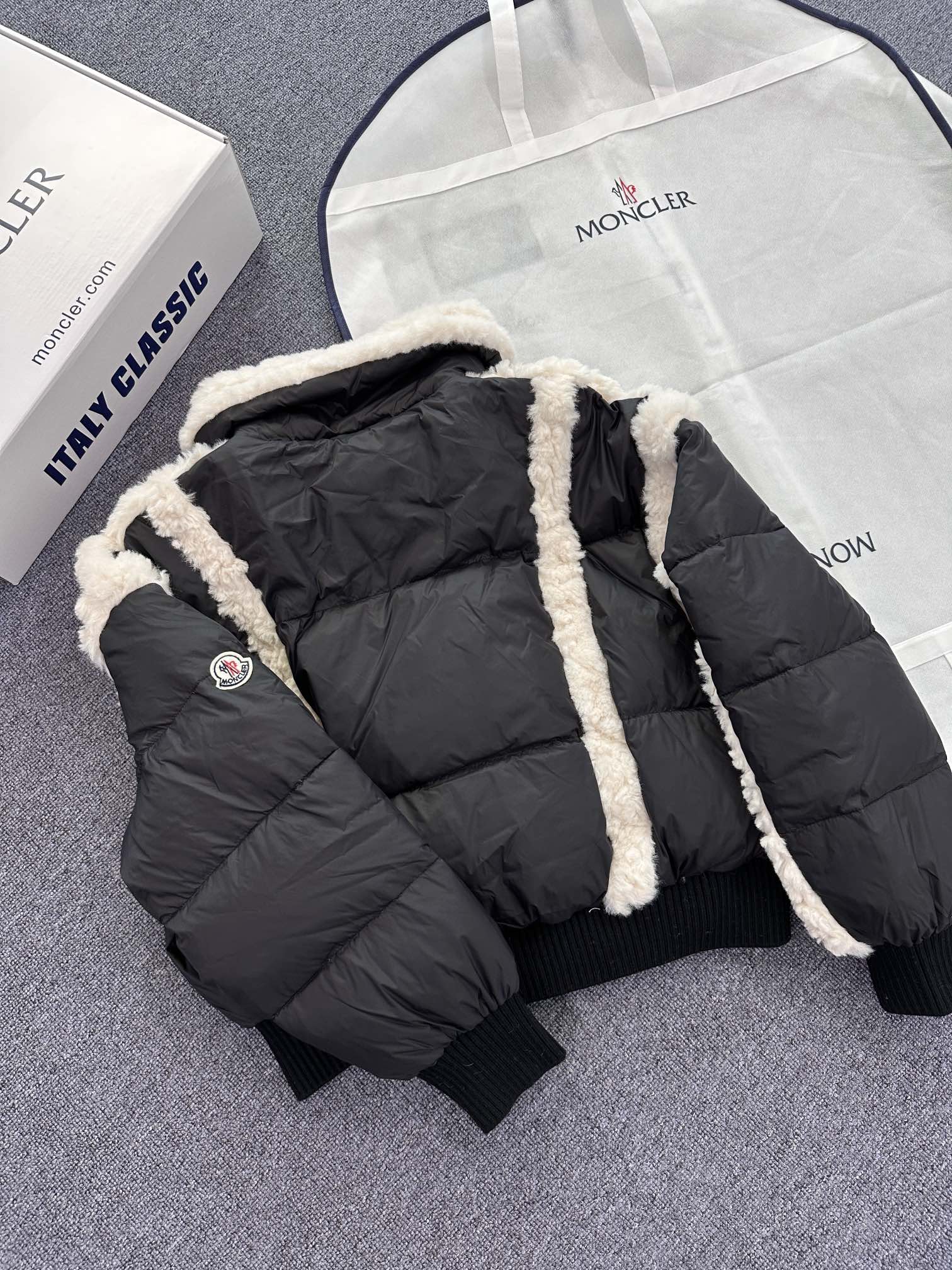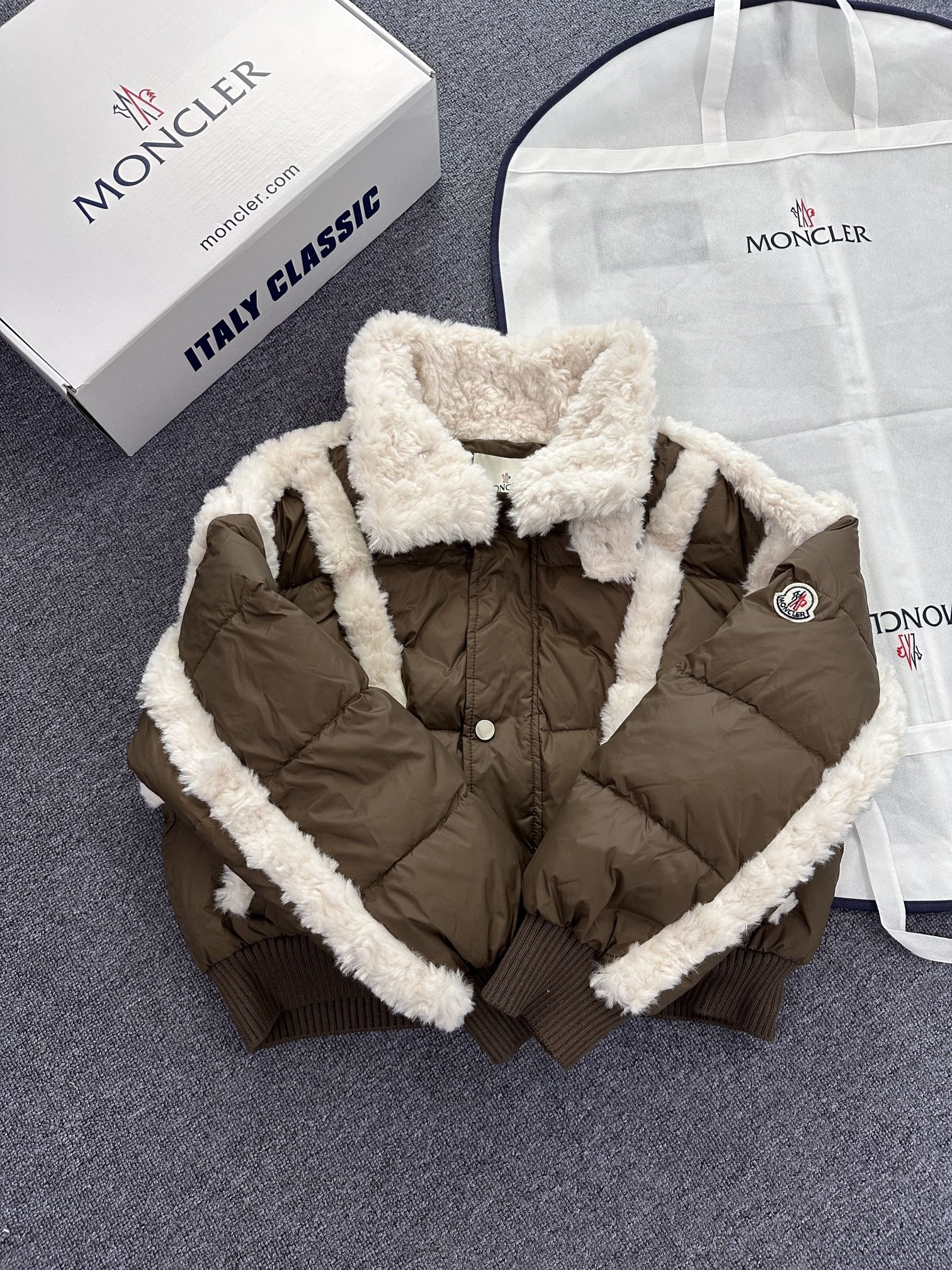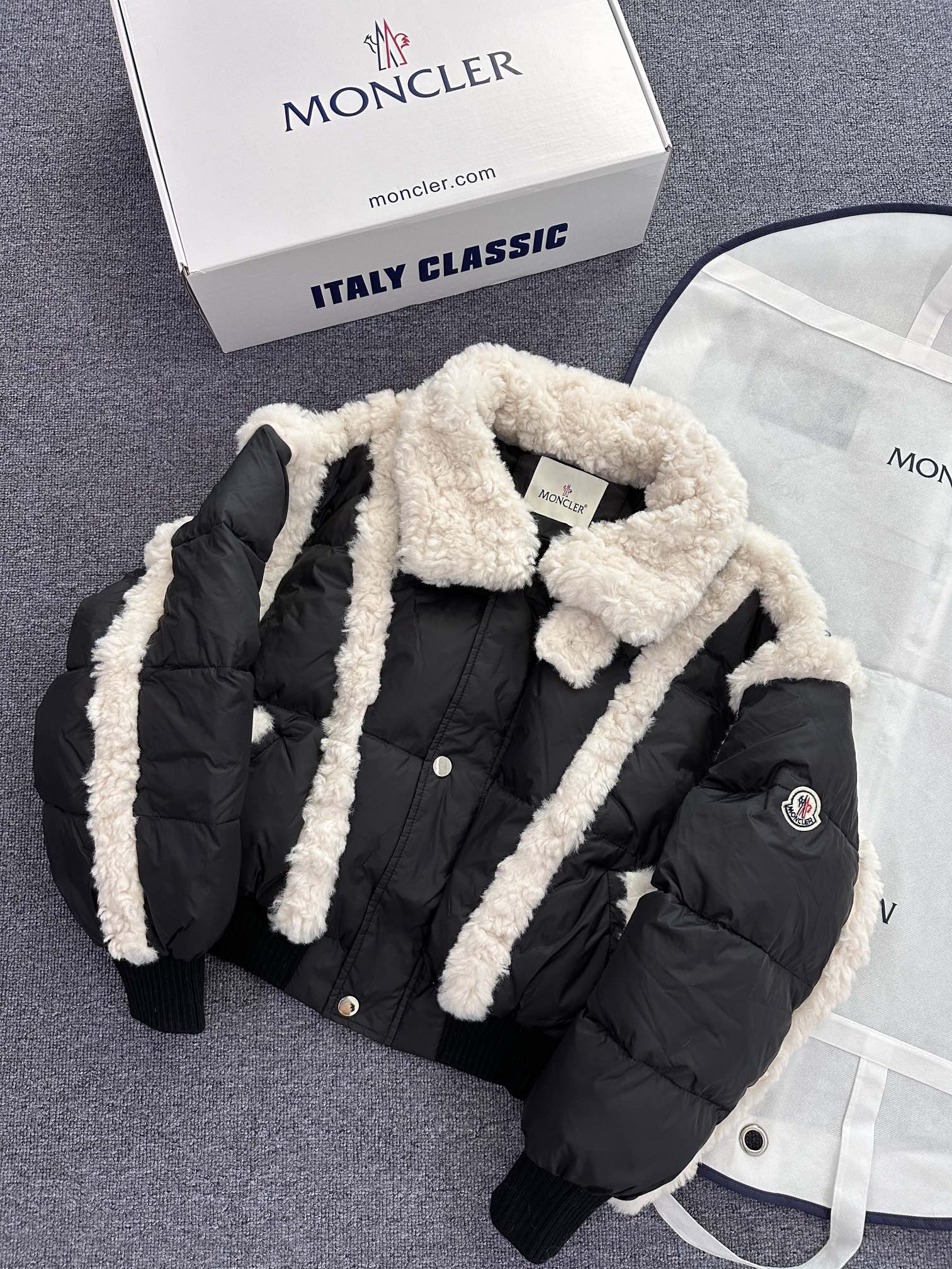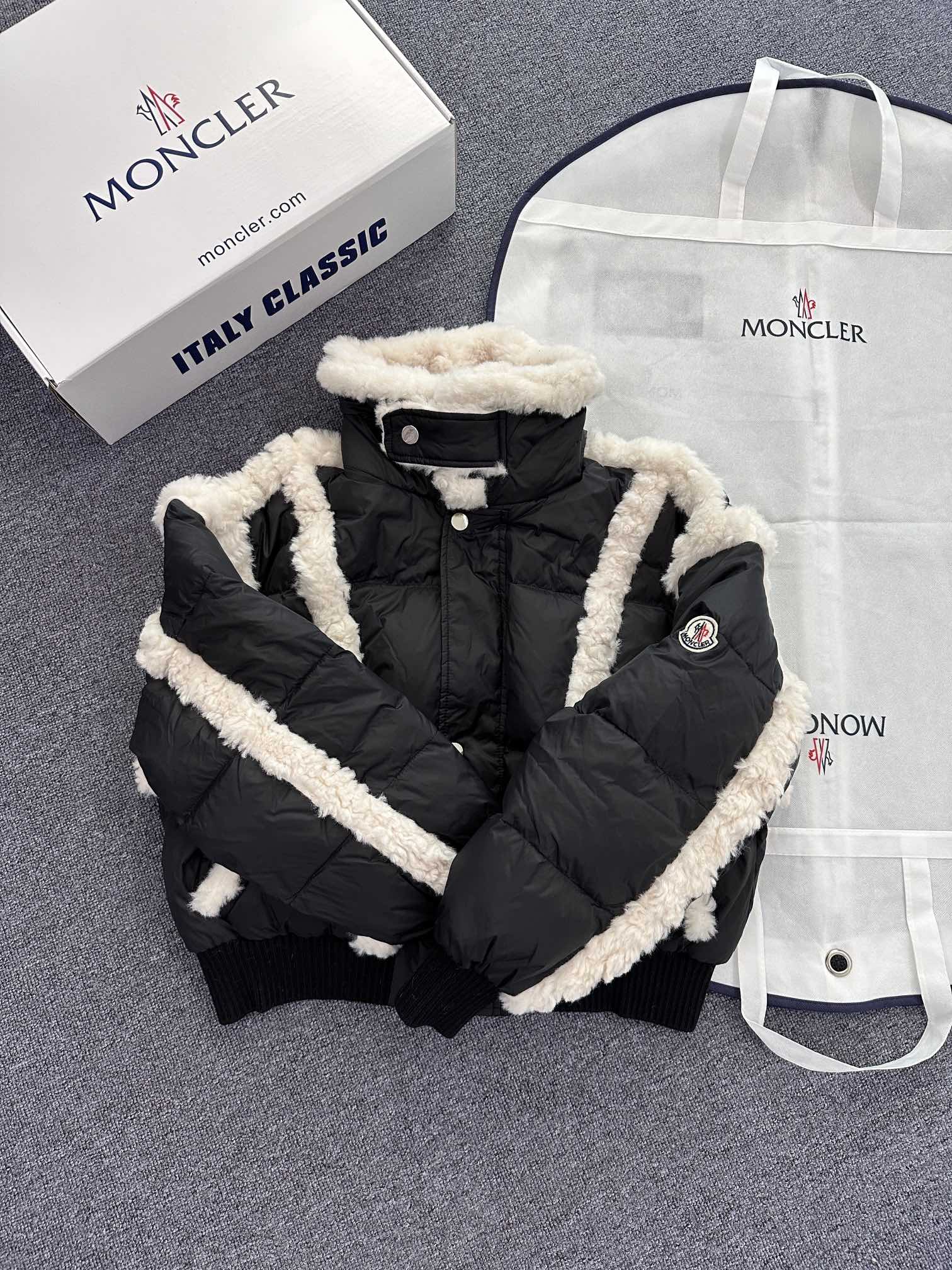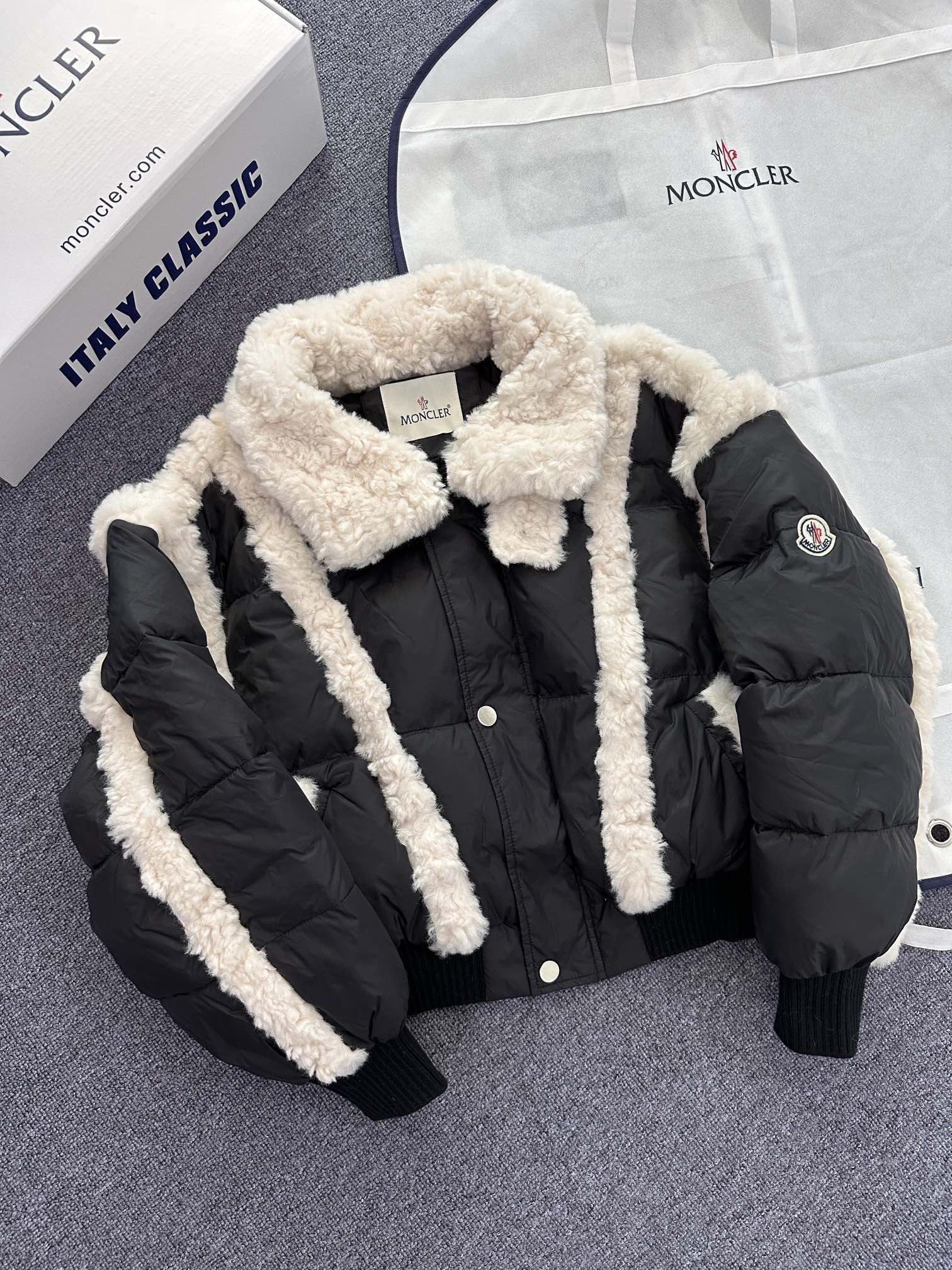 New arrival from Moncler – a women's down jacket that blends elegance and comfort. Made with premium goose down and nylon fabric, it features a stylish mix of down and shearling for superior warmth. Lightweight, cozy, and fashion-forward, available in two color options.