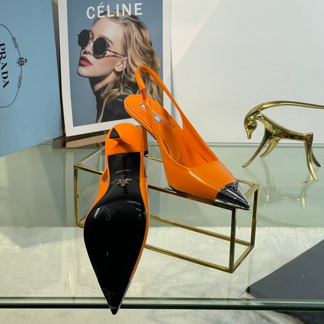 A bold fusion of elegance and edge, these Prada slingback heels feature a glossy finish, pointed silhouette, and metal toe detail. Accented with the iconic Prada logo, they redefine modern luxury with a sporty yet feminine flair.