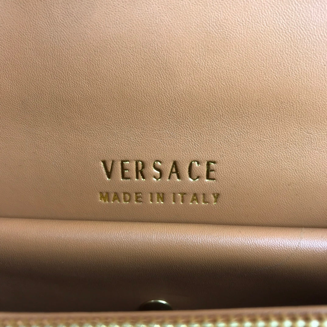 Unveiled in the latest runway collection, the Virtus Deity Shoulder Bag takes its name from a Roman goddess who symbolizes power, courage, and character. Designed for the bold and confident, this structured silhouette features a magnetic flap closure, a sleek top handle, and an adjustable shoulder strap for versatile wear. At its heart lies a gold-tone metal Barocco “V” emblem, a signature detail inspired by the iconic Versace design language.