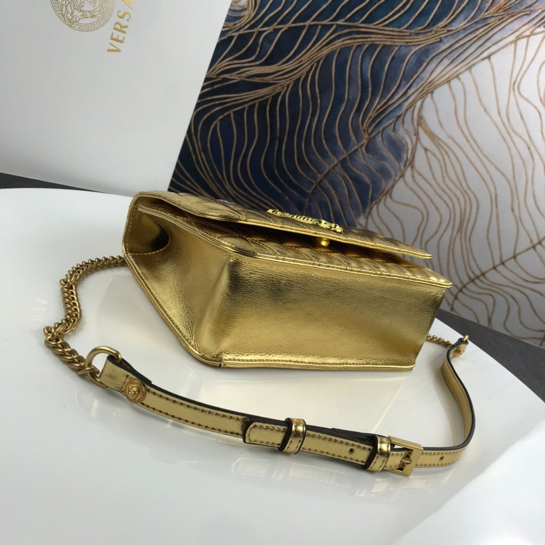 Unveiled in the latest runway collection, the Virtus Quilted Leather Bag is named after a Roman goddess who represents strength, courage, and character. Crafted from luxurious leather adorned with elegant V-shaped quilting, this bag embodies both power and refinement. Functional and fashionable, it features a magnetic flap closure, a structured top handle, and an adjustable shoulder strap for versatile styling. At its center, a striking gold-tone metal Barocco 'V' emblem pays homage to Versace’s iconic design language.