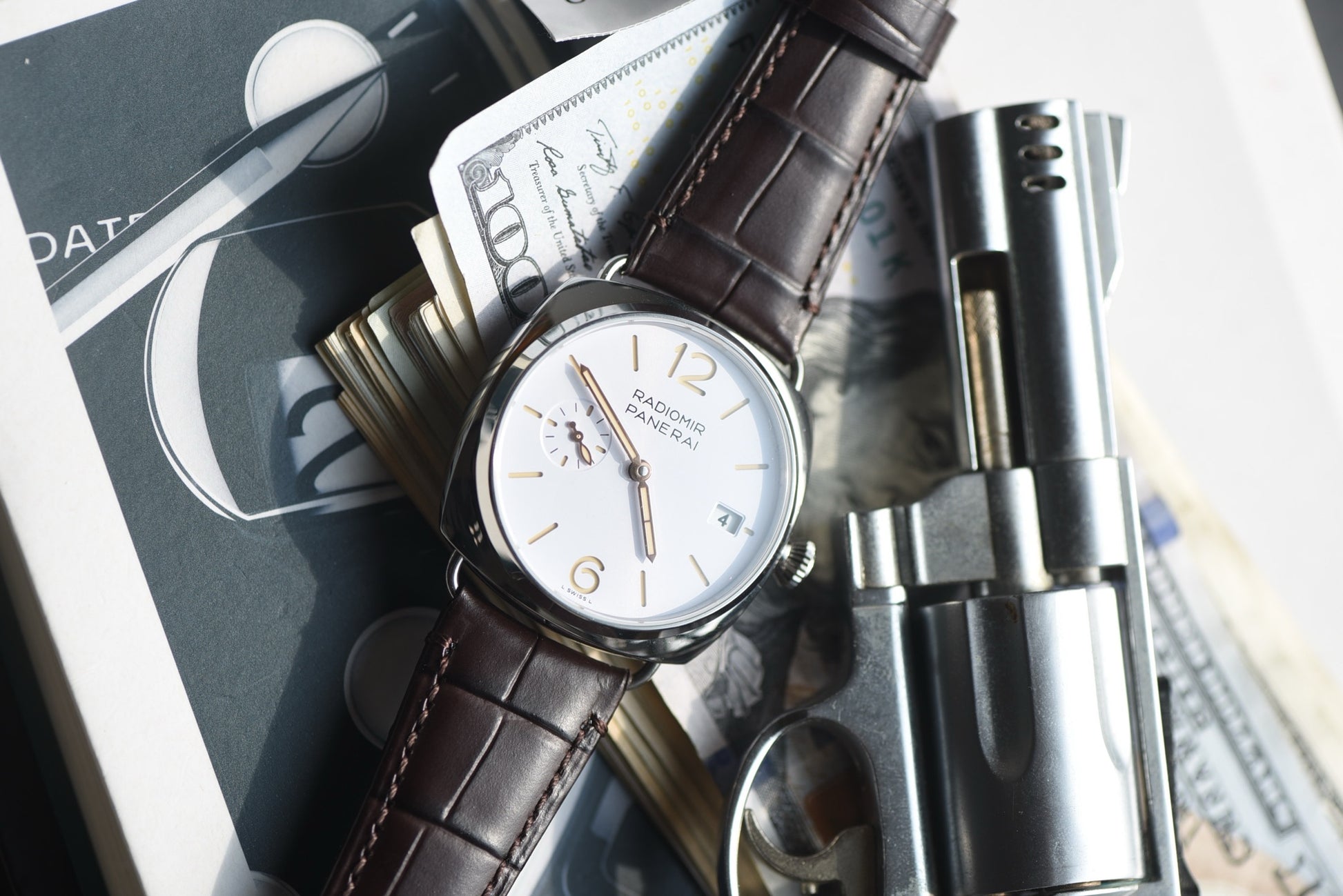 This Panerai PAM1292 features a refined 40mm case with durable sapphire crystal. Ideal for smaller wrists, it retains the brand's bold character in a more compact, wearable size—perfect for everyday luxury and style.